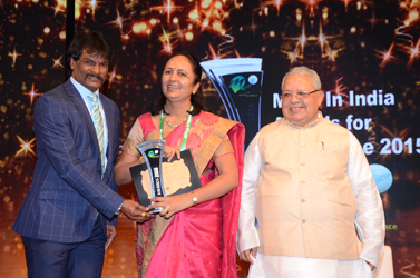 20 August 2015, Jalgaon. ‘Crazy Mantra Group’ felicitated ‘Jain Irrigation’ by awarding ‘Make in India’ prize for adopting indigenous technology to imprint on worldmap in the field of agriculture and bio-technology. This prize was accepted by Ms. Sangeeta Ladhdha, Senior company official, at the hands of Cabinet Minister Shri. Kalraj Mishra and well-known Hockey player Shri. Dhanraj Pillay in the function held at Mahatma Mandir, Gandhinagar.